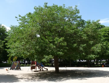 ¿Qué que pone en el cartelito de la Senda? Pues que en latín se llama Olmus minor y que la tristemente famosa grafiosis o enfermedad del hongo, ha terminado con la vida de muchos olmos del Retiro y de todas partes. De hecho en el siglo XIX el olmo era el árbol más abundante en el parque. Y menos mal que quedan algunos como éste, o el que vimos al principio de este capítulo, o también otro del que hablamos en “Los jardines de Cecilio Rodríguez”. En ambos hay fotos de los típicos frutos en “sámara” y también explicamos lo del escarabajo que trasmite el dichoso hongo y que tapona los vasos conductores del árbol.