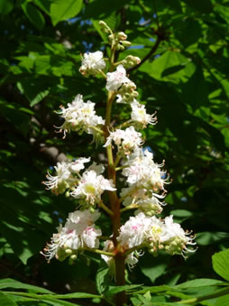 Según se entra a la izquierda hay un arbolito que es muy curioso: nada menos que un castaño de flores rosas (Aesculus rubra), como el que hay a la puerta del Florida Park: