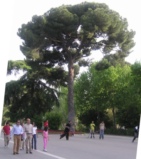 Los “pinos” que veíamos con los jugadores de hockey no son tales. Bueno, uno sí es un pino piñonero, pero el otro es un cedro. Al principio eran dos pinos, que fueron los únicos que se dejaron sin talar cuando se hizo el paseo y se les llamó “los Torenos” en homenaje al Conde de Toreno, que era el Comisario del Parque cuando se inauguró el Paseo de Coches.