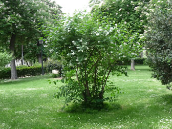 Cerca del kiosko hay un castaño de flores rosa de la especie Aesculus rubra. |